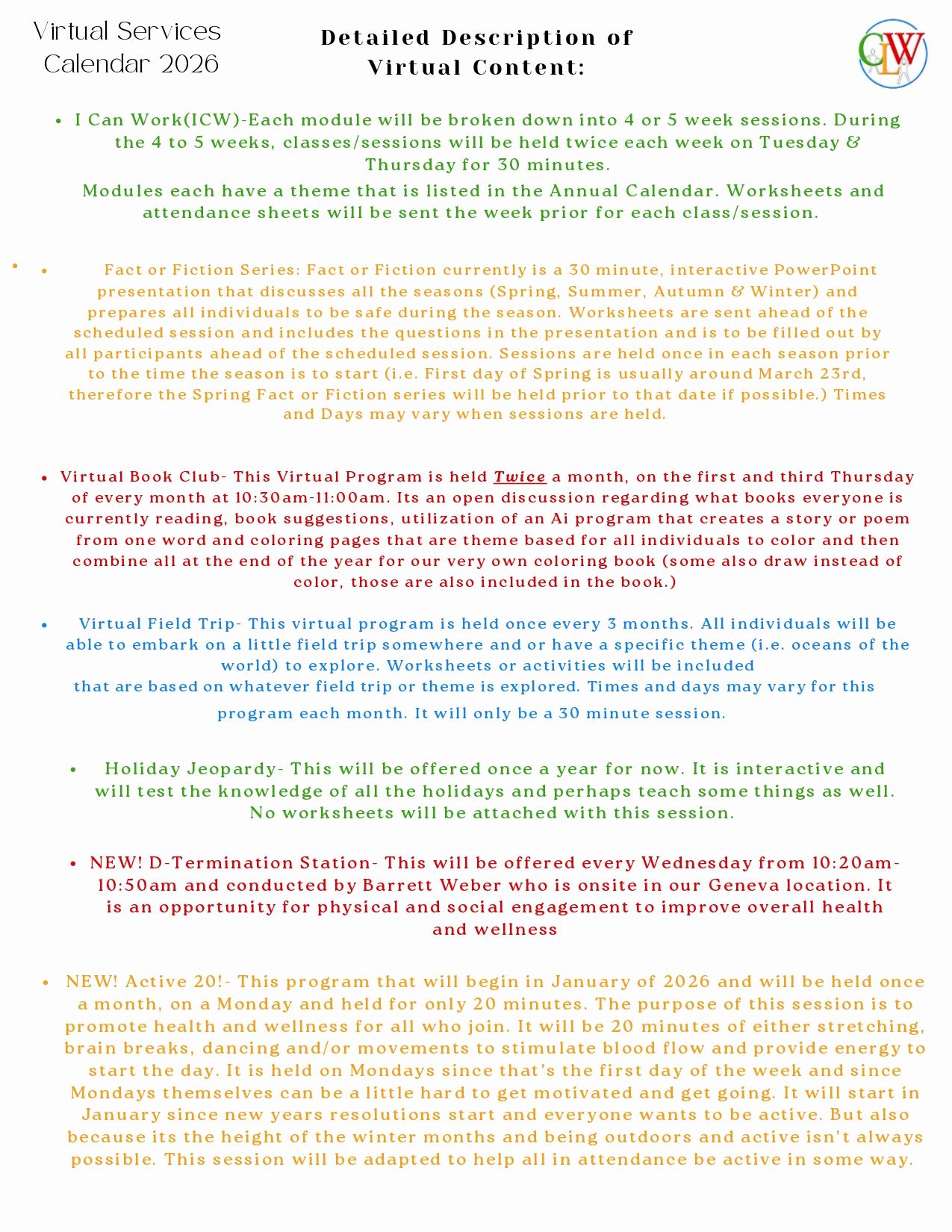Explore CLW’s full lineup of engaging virtual programs for Adult Day Services (ADS) and Vocational Development